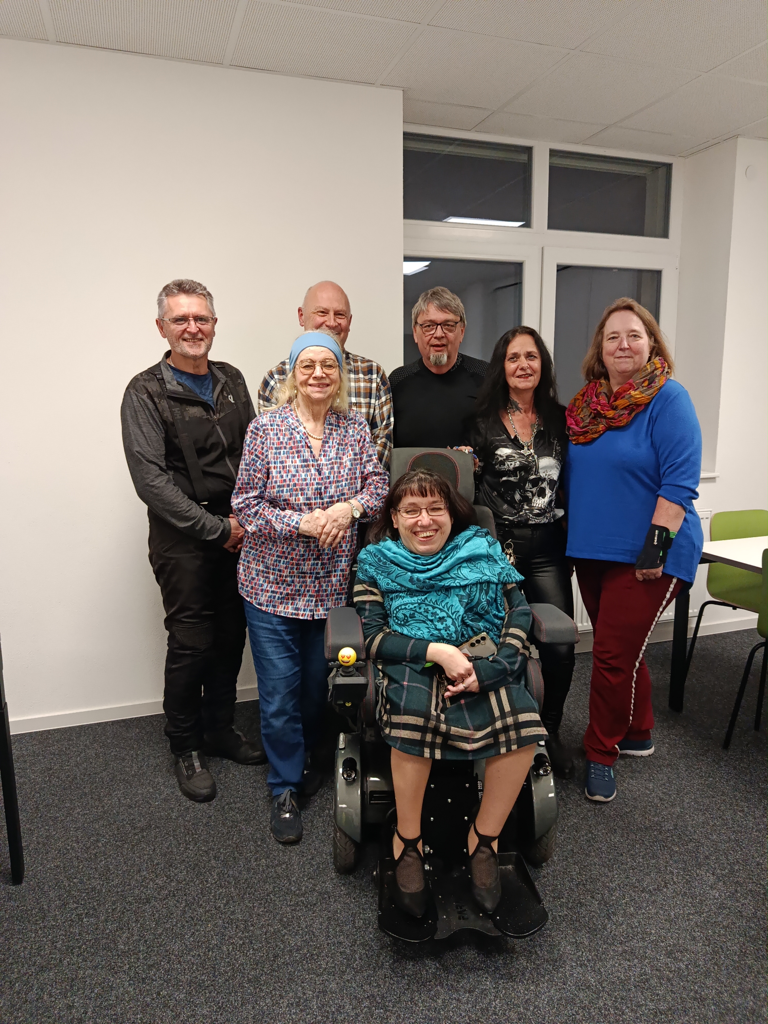 Helmut (Kreuzbund), Krüger (Dt. Parkinsonvereinigung Regionalgruppe Heilbronn), Christof (Burnout-Selbsthilfe Heilbronn), Monika (Gemeinsam besonders Stark), Detlef (Fibromyalgie Selbsthilfegruppe Heilbronn), Grisu (Day Walker), Regina (Fibromyalgie Selbsthilfegruppe Heilbronn). Nicht auf dem Foto: Manuela (Corona im Ländle)